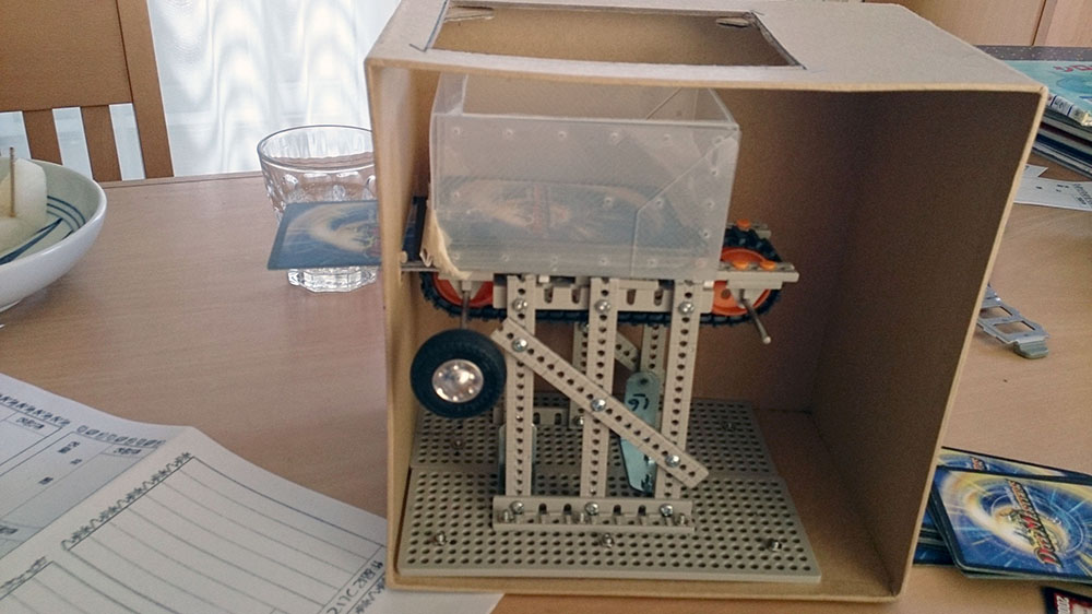 作者: 亮太 さん (小4・千葉)カードゲームにハマっているという亮太さんが作ったのは「ダンボールカードガチャ1号」! ゲーム用カードをダイヤル操作で排出してくれる便利メカです! ガチャのハンドルとしてタイヤ、ベルトコンベアとしてトラック(履帯)を活用する仕組みになっており、カードを投入した状態でタイヤをクルクル回すと履帯が連動してカードを排出してくれます。動力は人力なので電気いらず! 工作の基本にかえった遊べるアイデア工作、すばらしいと思います!