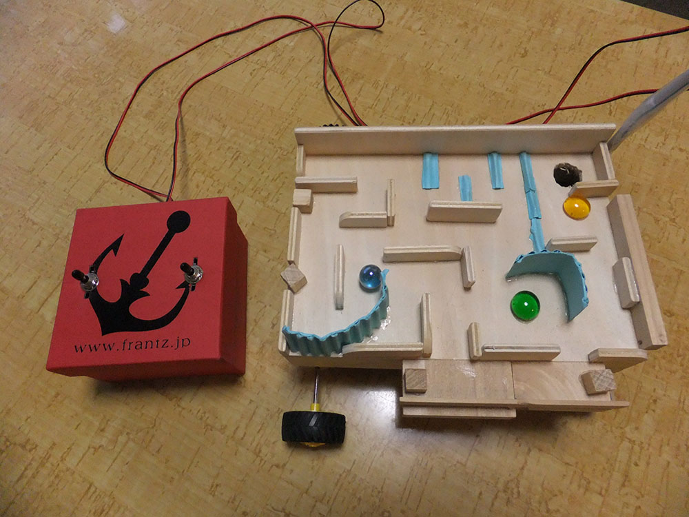 作者: きゃず さん (小5・千葉)きゃずさんの作品は、一見すると夏休み工作の定番ネタともいえる迷路工作。うわ懐かしい…と思いきや、迷路にはなにやらタイヤがついていて、さらにはリモコンボックスも! 実はこれ、迷路自体がリモコン車両。迷路上のビー玉の動きをリモコン制御でコントロールする次世代迷路工作なのです! ただでさえ難しいビー玉迷路が、リモコン操縦を介することによって難易度倍増。「イライラ迷路」の名にふさわしい作品といえるでしょう!