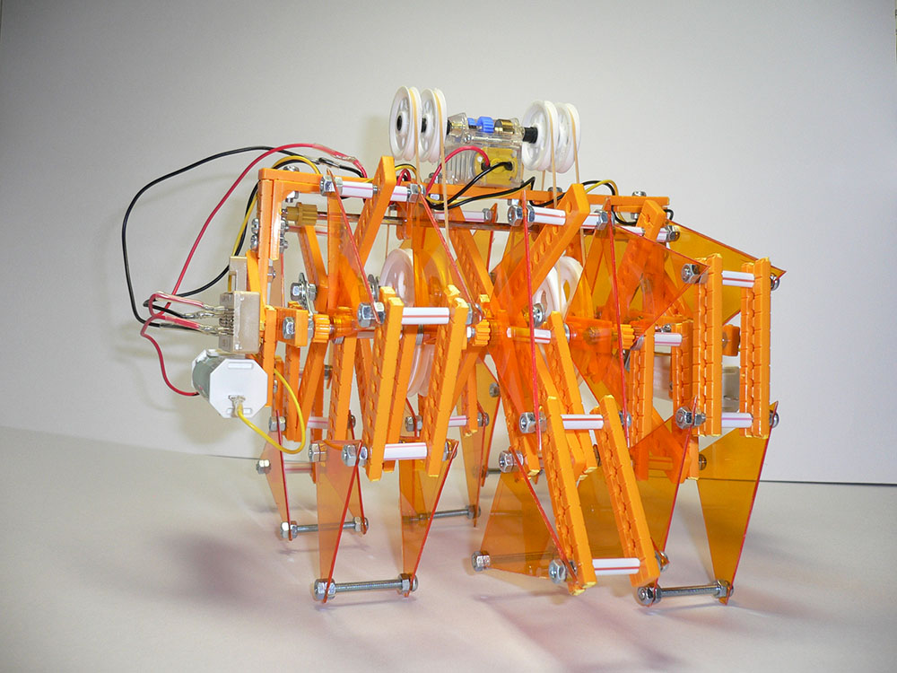 作者: あおい さん (小4・宮城)テオ・ヤンセン氏のアート作品「リノセロス」を見て面白いと思ったというあおいさんの作品はその名の通り「リノセロスっぽい歩くロボット」。WEBで見つけ出した動作機構の解説テキストを参考に作ってみたそうですが、ユニバーサルアームの穴の位置を活かせるように、全体の寸法をアレンジしたそうです。家族に協力してもらいながらの制作だったそうですが、努力のかいあって、ワシワシ動く独特の挙動がしっかり再現されています。全体のカラーバランスもいい感じで、このままロボクラフトシリーズにあっても違和感なさそうです!