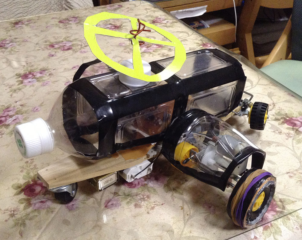 作者:智丹 さん (小4・千葉)ひと目でそうじ用メカであることがわかるこちらの作品は智丹さんの「おそうじらくらくちりとり君」! フロントの両サイドに装着されたスライドスイッチのオンオフがリアのギヤボックスを制御するシステムになっており、主電源を入れるとちりとり君は前進、スライドスイッチをほうきでタッチすると押した方のタイヤが逆転、方向転換をする仕組みになっています。ロボの操縦を楽しみながら掃除もできちゃうナイスな1台、ゆるキャラ風の目もいい味出してます!!