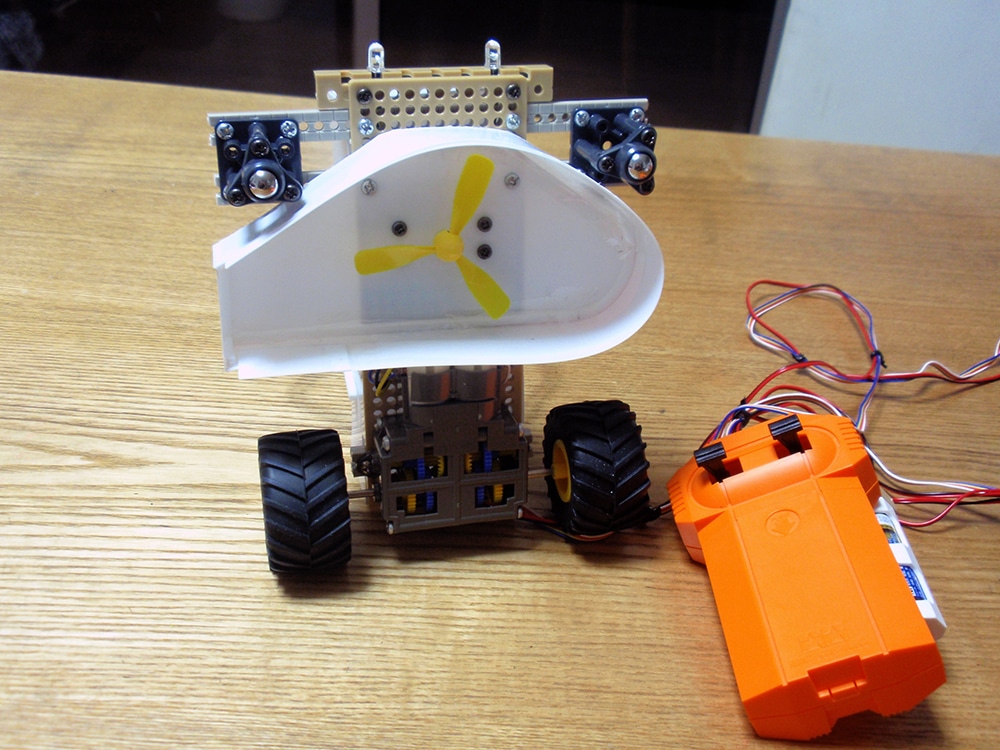 作者: 天至 さん (小5・兵庫)お父さんがZTR芝刈り機のギヤボックスを作っているという天至さんの作品は「ZTR芝刈り機風ラジコン」! ZTR(ゼロターンラディウス)というのはその場で方向転換できる、狭い場所で芝刈りする際の重要機能なのですが、この作品ではキャスターとギヤボックスを組み合わせることで、本物の芝刈り機と同様のZTR機構を実現しています! こうした工作作りを通じてメカの仕組みを学ぶというのはすばらしいことだと思います! ZTR機構のほかにも草刈り刃のかわりについたプロペラは、柴こそ刈れませんがゴミをサイドに吹き出すことができるようになっており雰囲気抜群。車体前部についているヘッドライトは方向指示器の機能も兼ねており、右折時には右側、左折時には左側、前進時には両方のライトが点灯するので安全性もばっちり。かなりの出来栄えです!