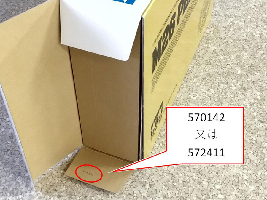 なお、同じロット番号であっても、今後出荷される製品には正しく組まれたギヤボックスが入っています。 対応済み製品には目印として、ギヤボックス小箱の左下隅に青色の丸いステッカーが貼られています。 [画像2]