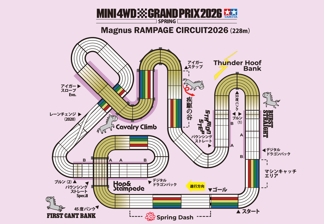 ただ速いだけでは勝てない。コース各所にバンク、急坂、凸凹がちりばめられ、すべてに対応する総合力が問われる全長228mのミニ四駆グランプリ2026スプリング公式サーキットです。