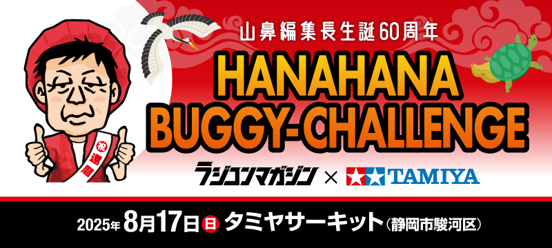 ラジコンマガジン編集部編集長「山鼻昌弘」氏の生誕60周年を記念したイベント、「HANAHANA BUGGY-CHALLENGE」を「タミヤサーキット」にて開催‼編集長も参加予定の【ホットショット4WD】、最新バギーカーで競う【DT-04】、人気バギーシリーズで楽しむ【DTチャレンジ】を開催。当日はフリー走行のみでの参加も出来ます。ラジコンマガジン編集長と1日RCレースを楽しみたいという方、ぜひご参加下さい。とっておきの夏休みを楽しみましょう!