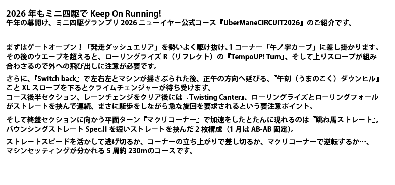 | 2025/12/23 | ミニ四駆グランプリ2026ニューイヤー公式コース『Uber Mane CIRCUIT2026』公開! |