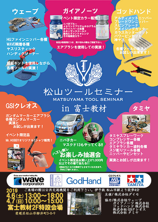 模型製作に欠かせないエアブラシや塗料、ツール等、買って試してみないと使用感がわからない。そんなモデラーの皆様に各メーカー一押しの商品をタッチ&トライしていただくイベント、ツールセミナーを四国、愛媛県松山市で開催します。もちろん来場無料。その場でお気に入りのアイテムをお求めいただけます。