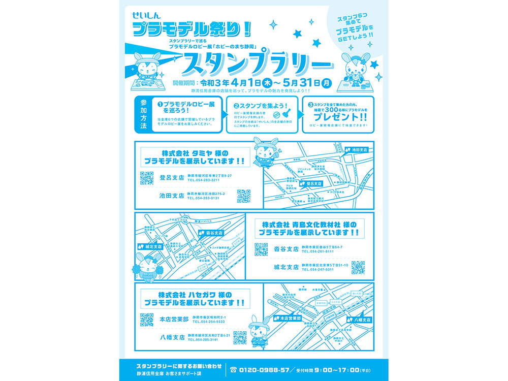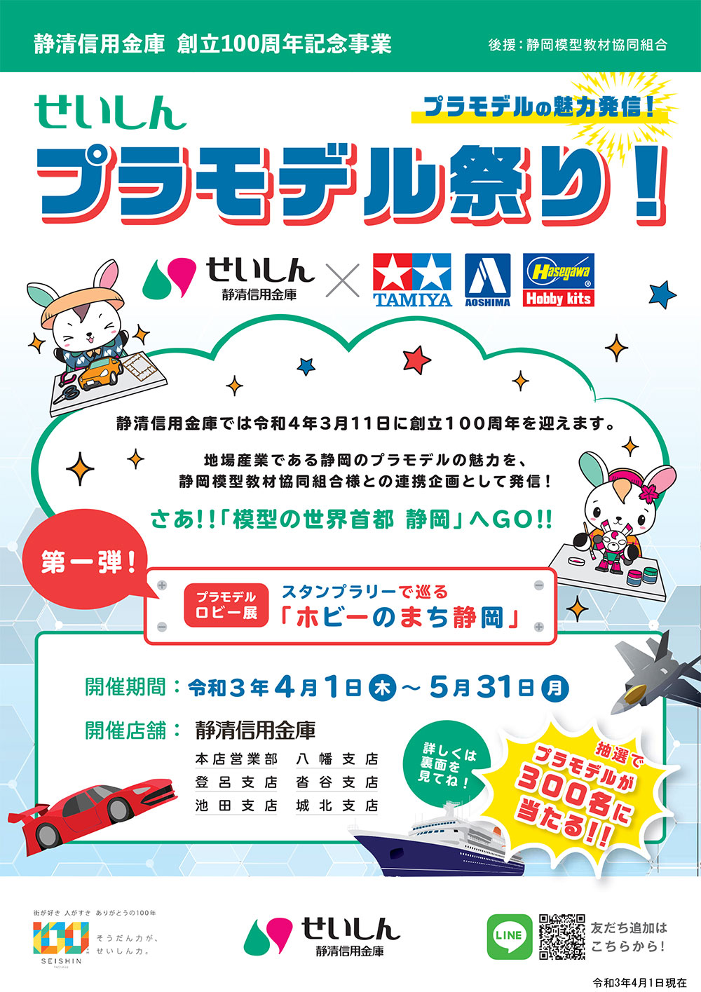 静岡の金融機関「静清信用金庫」様の創立100周年記念事業の一環として、静岡模型教材協同組合との連携企画「せいしんプラモデル祭り!」が開催中です。静岡市内の6店舗で青島文化教材社様、ハセガワ様、タミヤの製品展示やスタンプラリーを実施。お近くにお越しの際には是非お立ち寄りください。