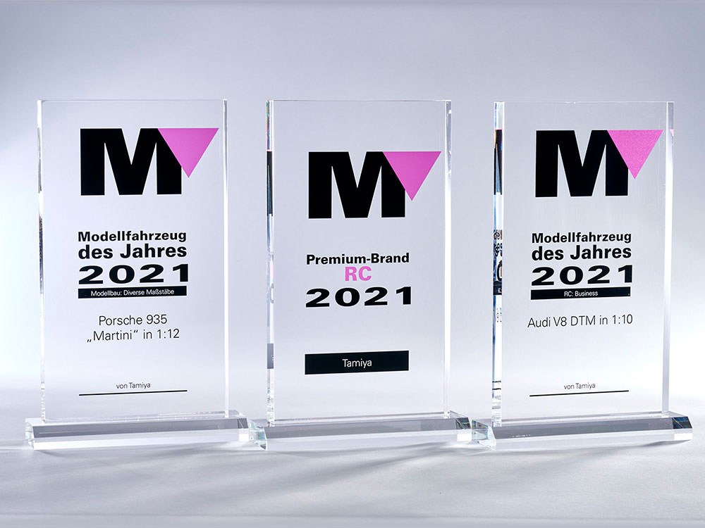 また車やバイクのスケールモデル・RC・ダイキャスト、スロットカー等を幅広く扱うドイツのミニチュアモデル専門誌「Modell-Fahrzeug(モデルファールツォイク)」が選出する2021年の優秀モデル賞「モデルファールツォイク・デス・ヤーレス」を「1/12 ポルシェ 935 マルティーニ」「1/10RC 1991 アウディ V8 ツーリング (TT-02シャーシ)」 が受賞。さらにタミヤとして「プレミアムブランド2021(年間最優秀ブランド)」を受賞いたしました。