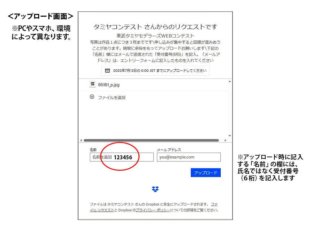 アップロードの際に記入する「名前」の欄には、氏名ではなく受付番号(6桁)を記入してください。