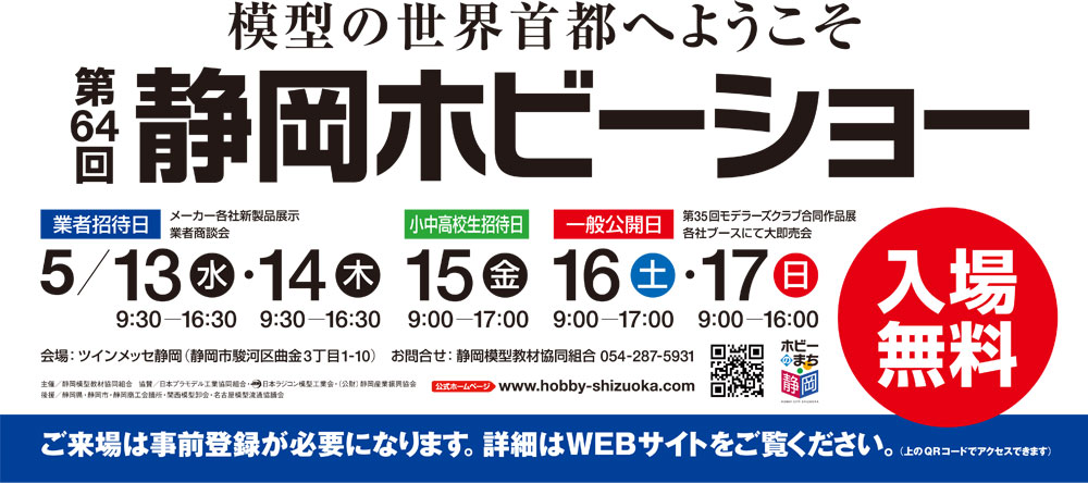 国内最大規模の模型ホビーイベント「第64回 静岡ホビーショー」が今年も開催されます。タミヤブース(北館 ブース3番)ではこれから発売される新製品を一挙に展示。今回も各ジャンルで注目の新製品が目白押し!発売前の新製品を会場でじっくりとご覧いただけるのはもちろん、説明スタッフに気になるポイントを直接質問できるまたとない機会です。新緑の静岡へ、ホビー尽くしのビッグイベントにご家族揃ってお越しください。