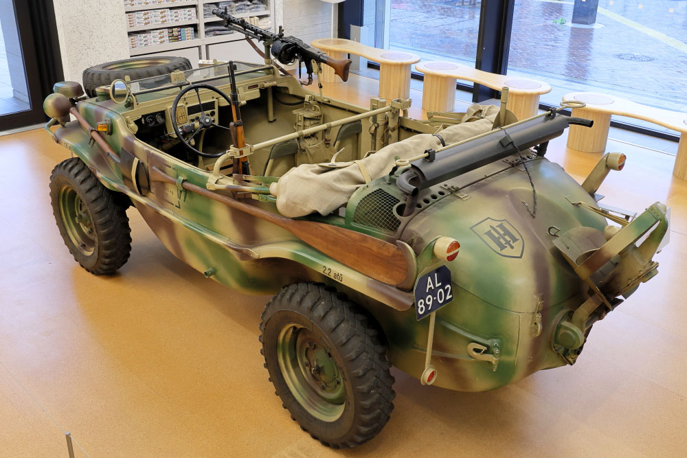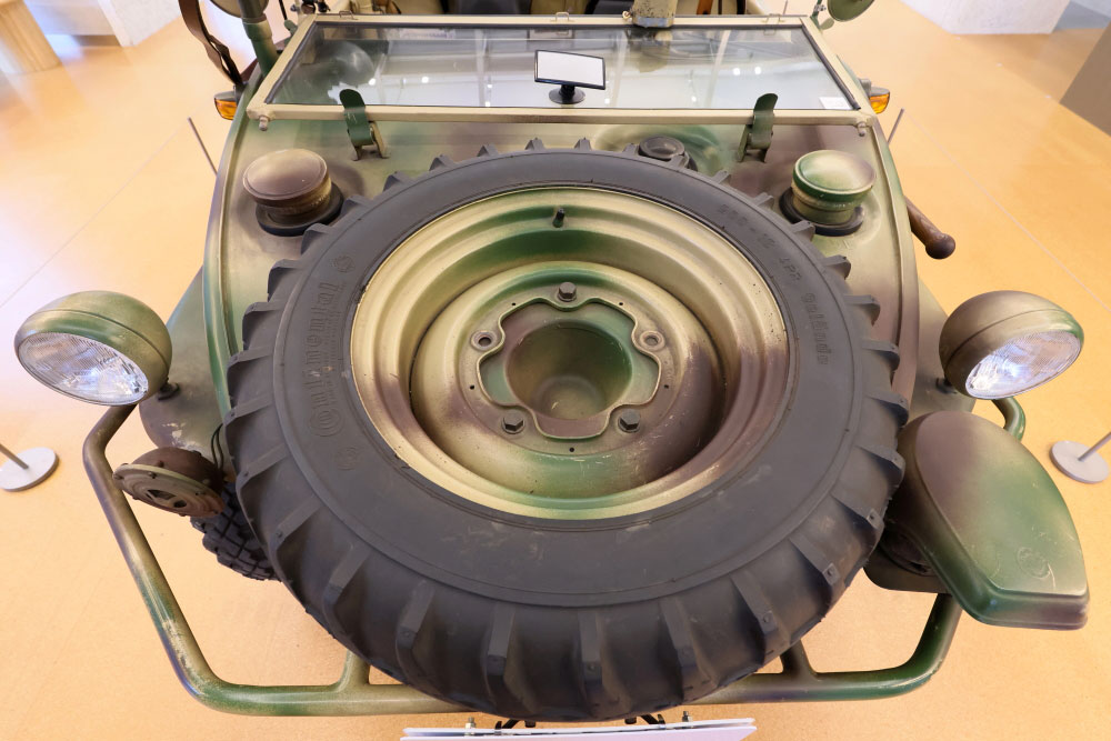 ※写真のシュビムワーゲンは日本の道路を走行できるようナンバープレートやウインカーなどが追加されており、第二次大戦時の姿とは異なる部分があります。