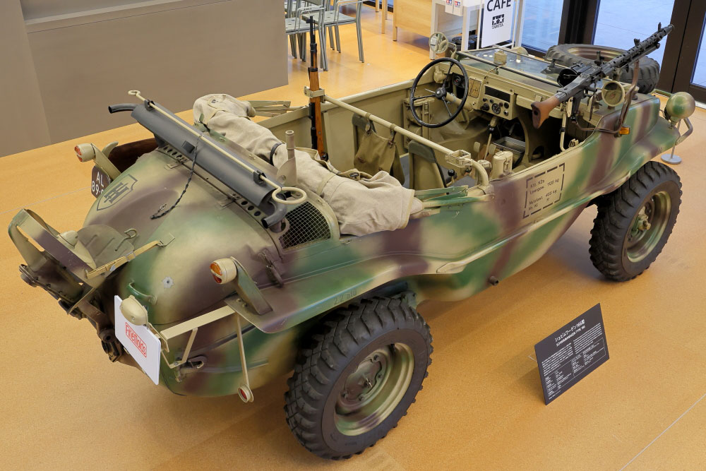 2026年3月10日(火)から27日(金)の間、TAMIYA PLAMODEL FACTORY TOKYOで展示された水陸両用車輌「シュビムワーゲン166型」 ワイドホイール仕様の実物車輌写真を紹介します。第二次大戦中に製造された貴重なシュビムワーゲンのディテールをご覧ください。