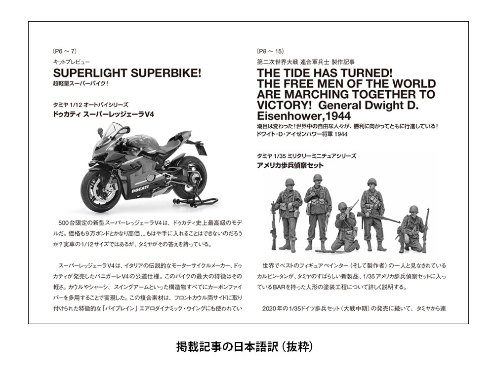 イギリスで編集・発行される「タミヤモデルマガジン」。日本のモデラーとはひと味違う作風が興味たっぷり。自作パーツやアフターマーケットパーツをふんだんに盛り込んだ製作例、キットをストレートに組み立てて塗装で実感を演出した作品などその仕上げ方は様々。なにより、作者が楽しんで取り組んでいる様子が伝わってきます。また、国内用として一部掲載記事の日本語訳が付いています。