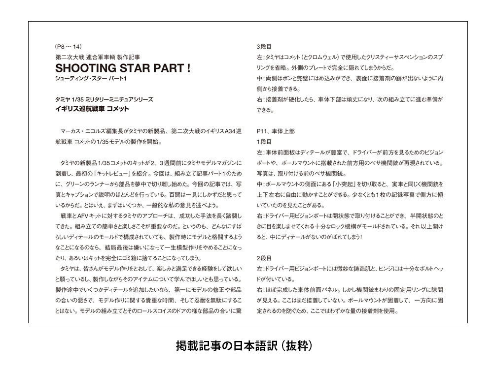 イギリス巡航戦車 コメット(1/35)、ソビエト快速戦車 BT-7 1937年型(1/35)の自走榴弾砲への改造、フォード マスタングGT4(1/24)、デ・ハビランド バンパイアF3(1/48)の製作記事の日本語訳付き。この他に、F-104Gスターファイター戦闘爆撃機(1/32)の製作記事、ロッキード マーチン F-35A ライトニングII(1/48)、「スター・ウォーズ」マンダロリアン チャイルド(1/3)のキットプレビューも掲載しました。