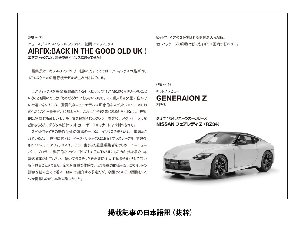 1/4トン小型四輪駆動軍用車(1/35)とM8グレイハウンド(1/35)を使った情景作品、ロッキード マーチン F-35A ライトニングII(1/48)の製作記パート1、アウディR8 LMS GT3(1/24)の製作記事に加えて、NISSAN フェアレディZ(RZ34)(1/24)、アブロ アンソンMk.I(1/48)のキットプレビュー、エアフィックス社のファクトリー訪問記、スケールモデルワールド2022のイベント・レポートの日本語訳付き。この他に、パチッコンテストの優秀作品も見ごたえの大判カラー写真で掲載しました