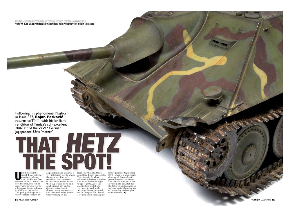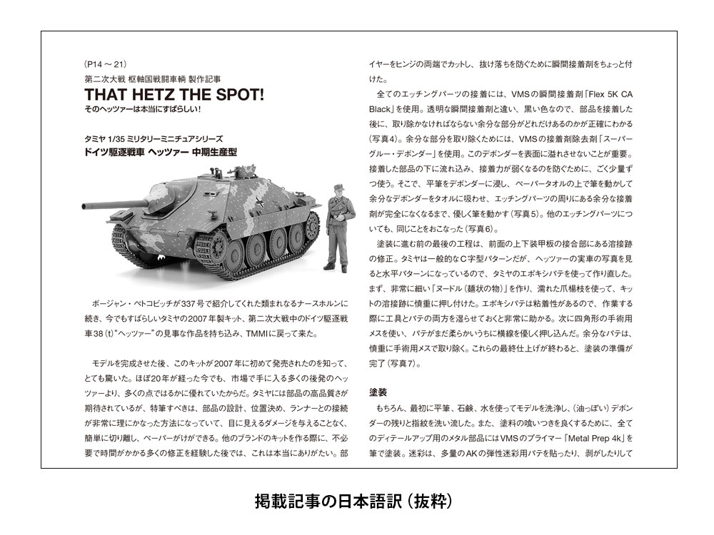 ドイツ駆逐戦車 ヘッツァー 中期生産型(1/35)、ポルシェ 934 ヴァイラント(1/12)パート3、旧日本海軍航空母艦 加賀(1/350)、ノースアメリカン B-25 ミッチェル(1/72)の製作記事、ドイツIV号戦車F型・伝令バイクセット“北アフリカ戦線”(1/35)のキットプレビューの日本語訳付き。この他、編集後記としてドイツ連邦軍 レオパルト2 A7V (1/35)、キットプレビュー・スペシャルとしてロッキードマーチン F-35B ライトニングII(1/48)、多くのミニキットプレビューも掲載しました。