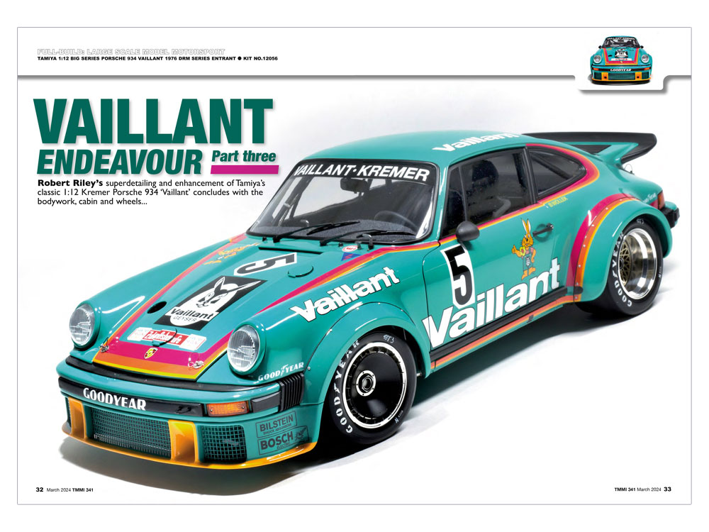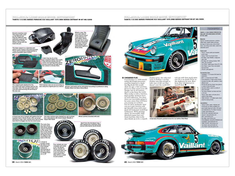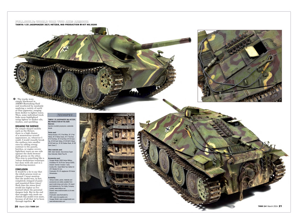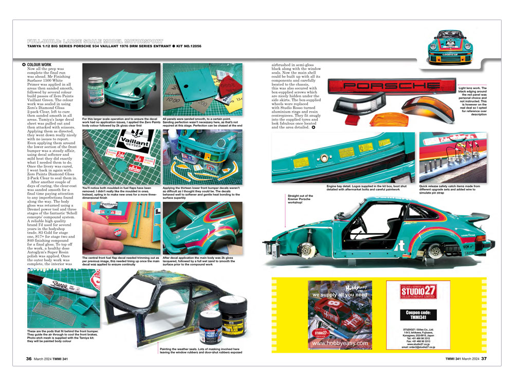 341号は、3ヶ月にわたって紹介され、ついに完成したポルシェ 934 ヴァイラント(1/12)の製作記事をはじめ、効果的なウェザリングにより重量感たっぷりに仕上げられたドイツ駆逐戦車 ヘッツァー 中期生産型(1/35)、エッチングパーツをふんだんに使ったディテールアップと甲板上を埋め尽くした艦載機が見ごたえの旧日本海軍航空母艦 加賀(1/350)の製作記事、さらに1975年に発売されたマッチボックスの名作キット、ノースアメリカン B-25 ミッチェル(1/72)も見応え十分。加えて、ドイツIV号戦車F型・伝令バイクセット“北アフリカ戦線”(1/35)のキットプレビューなども掲載しました。この他、パーツレビューや参考資料も紹介した内容豊富な1冊です。一部記事の日本語訳付き。