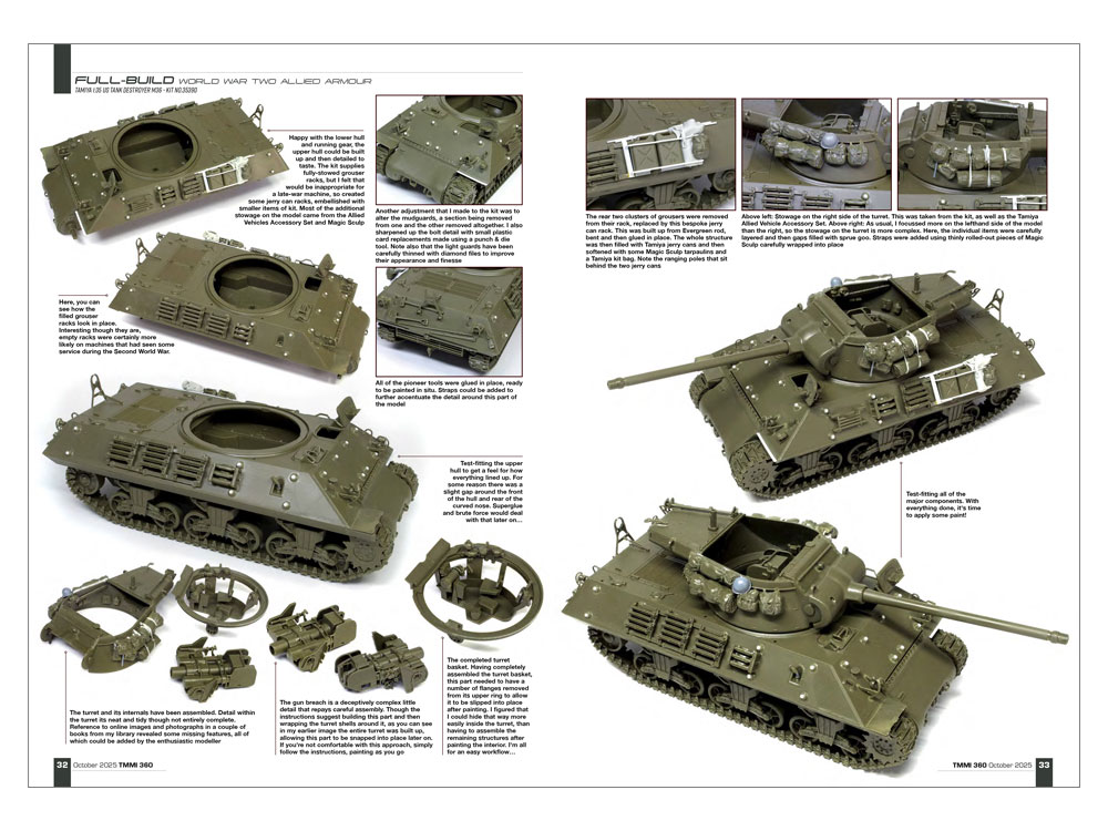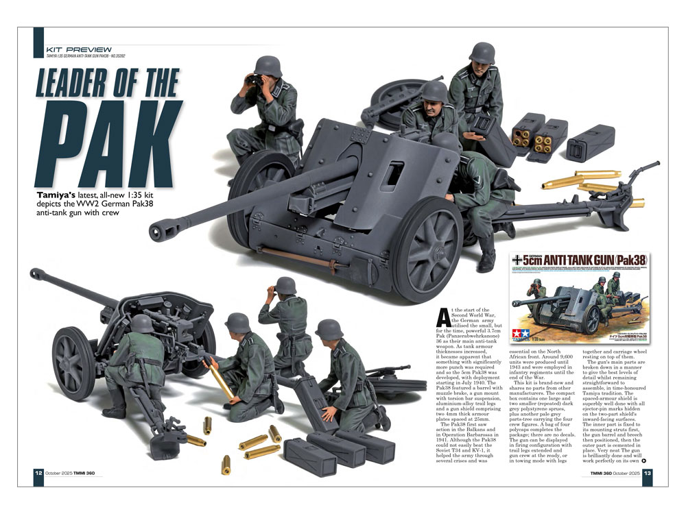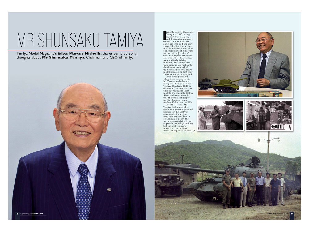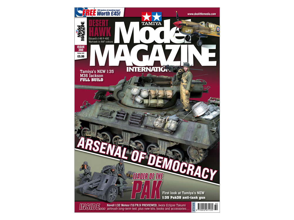 360号は、真紅のボディが印象的なルノー5ターボ(1/24)を実感の内装と足まわりで仕上げた作品、アメリカ軍の車輌らしく車体に装備品を満載し、重量感たっぷりの塗装を施したアメリカ駆逐戦車M36(1/35)、砂漠迷彩と質感あるウェザリングが目を引くイギリス空軍の戦闘機、P-40E ウォーホーク(1/48)の製作記事をはじめ、ドイツ 5cm対戦車砲 Pak38(1/35)とグロスター ミーティア F.8/FR.9(1/32)のキットプレビュー、さらにタミヤモデルマガジンのマーカス・ニコルズ編集長が田宮俊作会長との思い出を語る追悼記事も掲載しました。