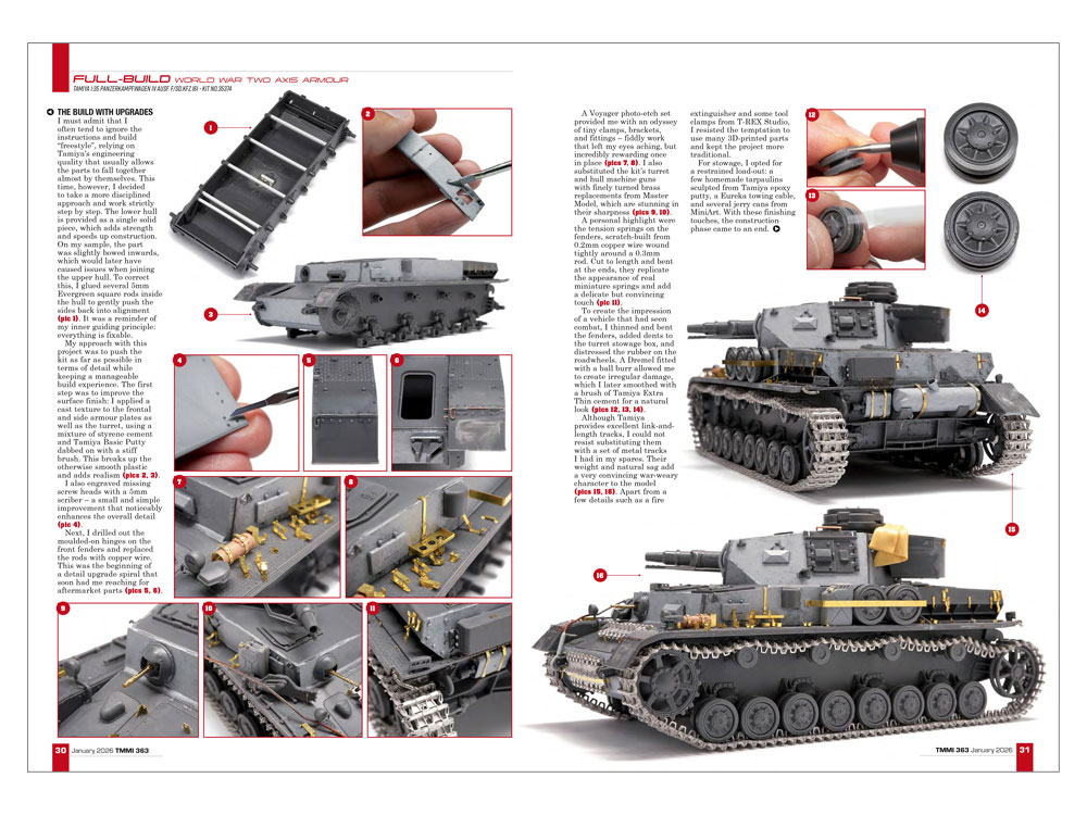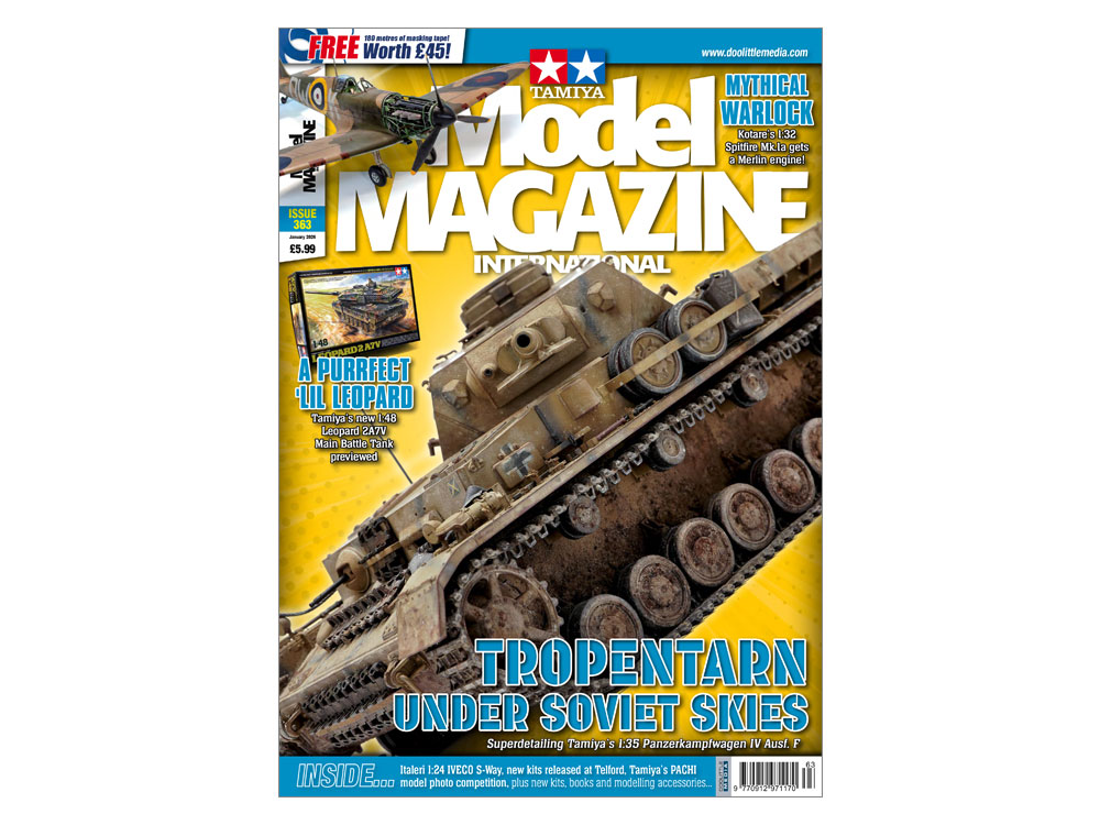 363号は、ディテールアップとリアルな汚しで重量感たっぷりに仕上げたドイツIV号戦車F型(1/35)、堂々としたボディとメカニズムが見ごたえのイベコ S-WAY トラック(1/24)、カウルを外してロールス・ロイス マーリン エンジンをじっくり見られる仕様に仕立てたスピットファイアMk.Ta中期型(1/32)の製作記事、さらにドイツ連邦軍主力戦車 レオパルト2 A7V(1/48)や1980年代のホットハッチの代表、プジョー205GTi 1.9(1/24)のキットプレビューを収録しました。
