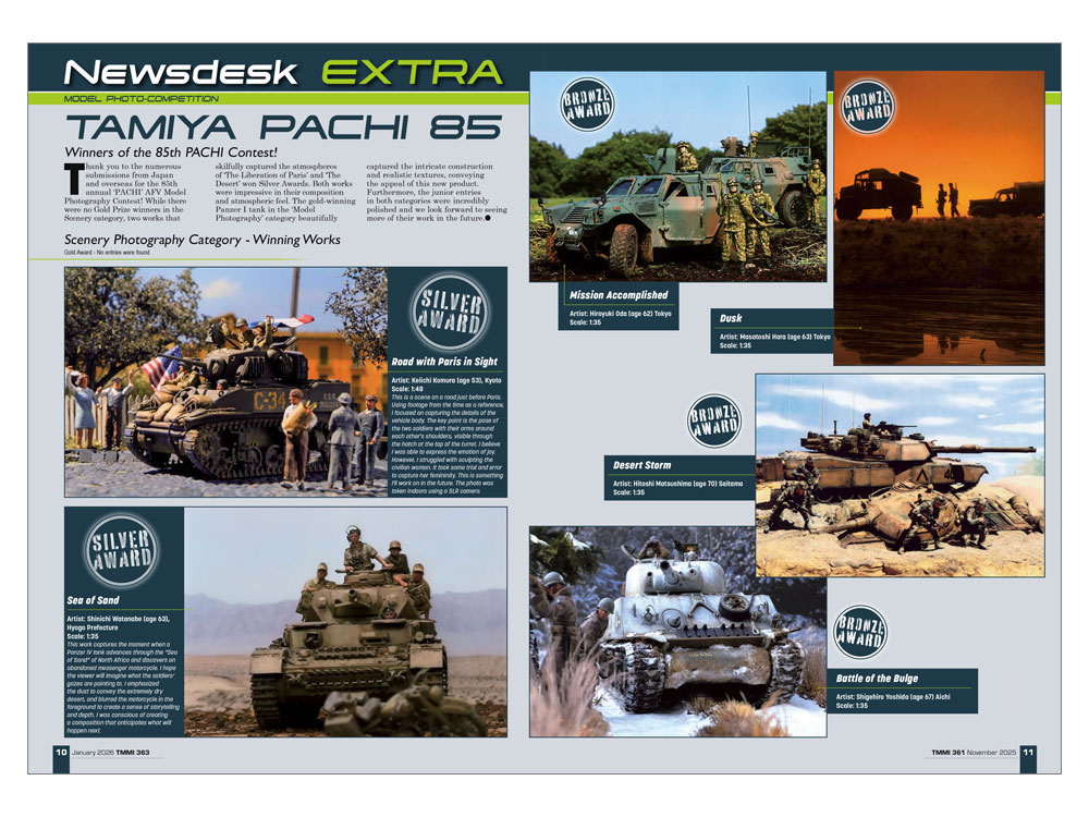 ドイツIV号戦車F型(1/35)、イベコ S-WAY トラック(1/24)、スピットファイアMk.Ta中期型(1/32)の製作記事の他、ドイツ連邦軍主力戦車 レオパルト2 A7V(1/48)やプジョー205GTi 1.9(1/24)のキットプレビューの日本語訳付き。その他にも、オーストラリア装甲砲兵博物館が所蔵するドイツ5cm対戦車砲Pak38の資料写真や第85回パチッコンテストの入賞作品、イギリスのモデル業界最大のイベント「IPMSスケールモデルワールド」の様子も掲載しました。
