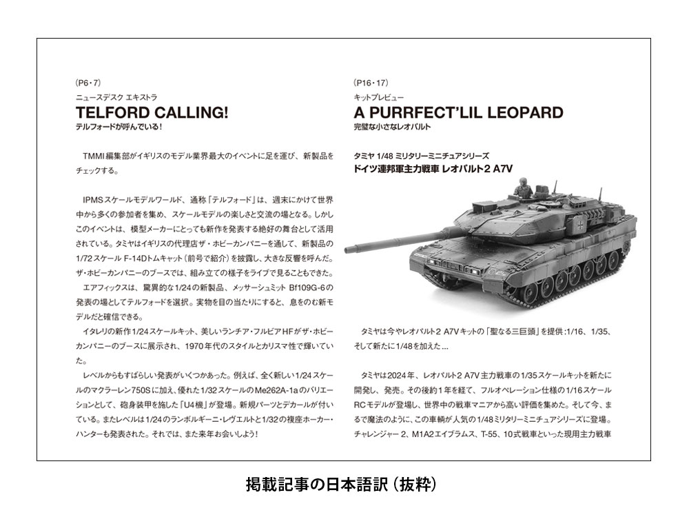 イギリスで編集・発行される「タミヤモデルマガジン」。日本のモデラーとはひと味違う作風が興味たっぷり。自作パーツやアフターマーケットパーツをふんだんに盛り込んだ製作例、キットをストレートに組み立てて塗装で実感を演出した作品などその仕上げ方は様々。なにより、作者が楽しんで取り組んでいる様子が伝わってきます。また、国内用として一部掲載記事の日本語訳が付いています。