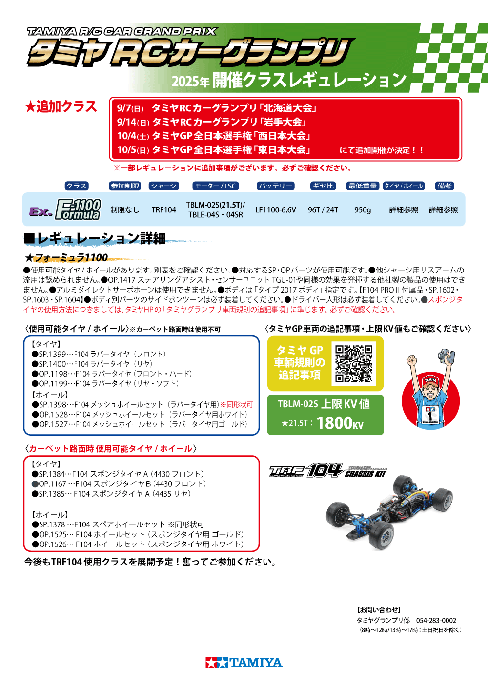 | 2025/06/5 | 新クラス開催のお知らせ 7/20(日)タミヤRCカーグランプリ掛川大会にて、TRF104シャーシを使用する「フォーミュラ1100」クラスを開催 |