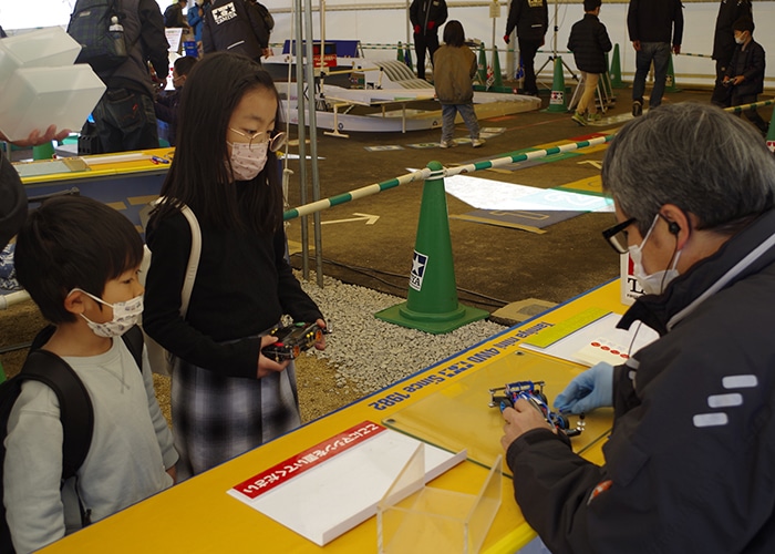 レース前の車検では、皆さんのマシンが公認競技会規則にそって作られているかをチェックします。車検を通過したらいよいよレーススタート!