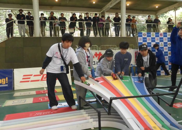 ■2026年のミニ四駆GPはスプリングシリーズも折り返しに突入!第4戦・掛川大会は「つま恋リゾート 彩の郷」での開催。28日(土)は終日練習日とし、29日(日)が本戦。トライアルクラス・ファミリークラス・ジュニアクラス・オープンクラスとチャンピオンズおよび特別表彰選手のレースを行いました。花冷えの中でしたが両日合わせて合計900名が参加。連続する僅差の好勝負に会場も湧きました。