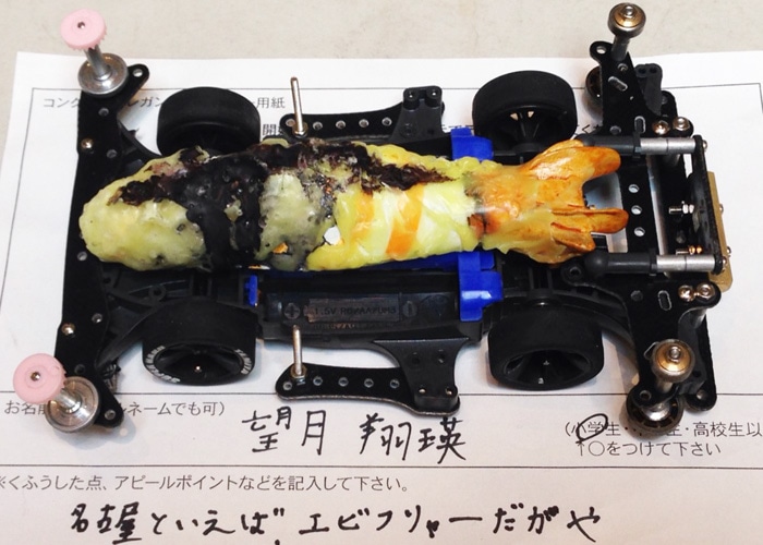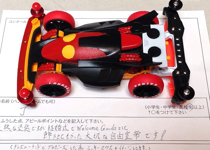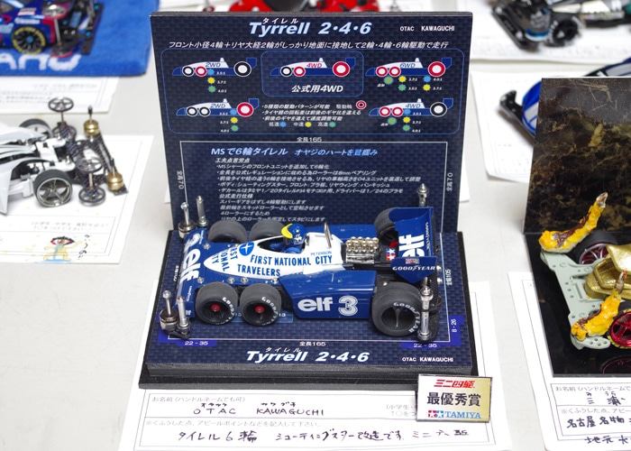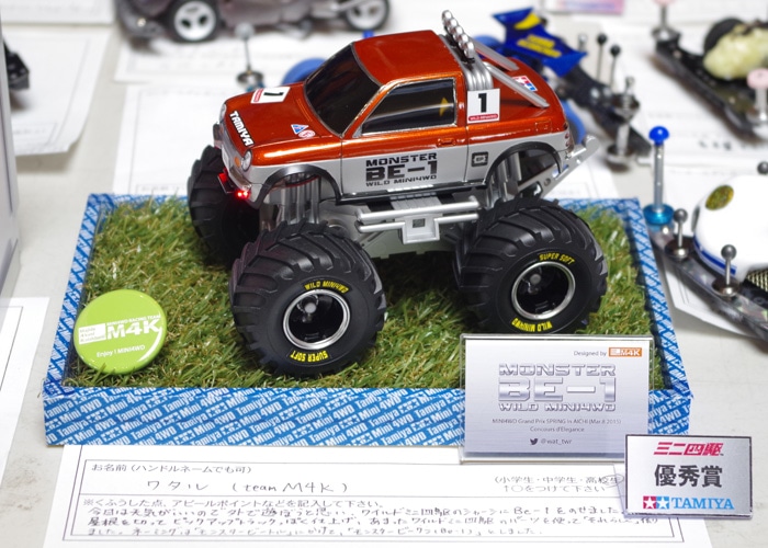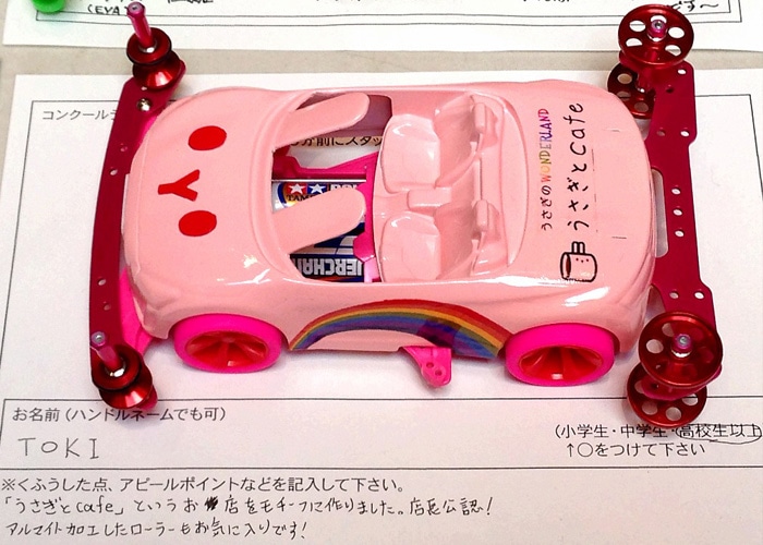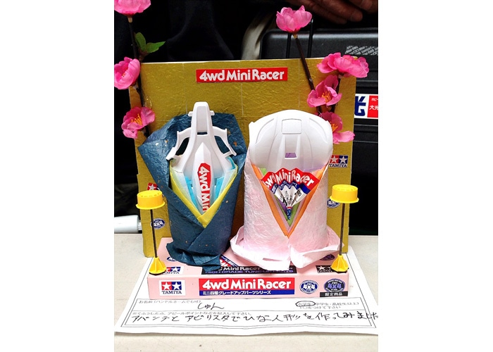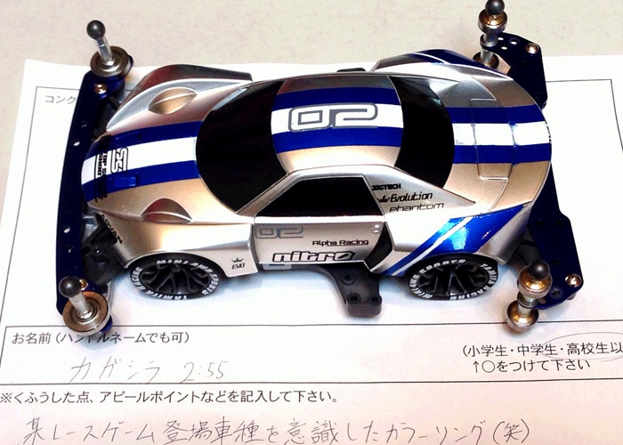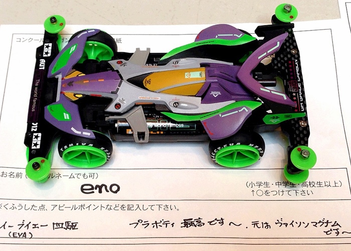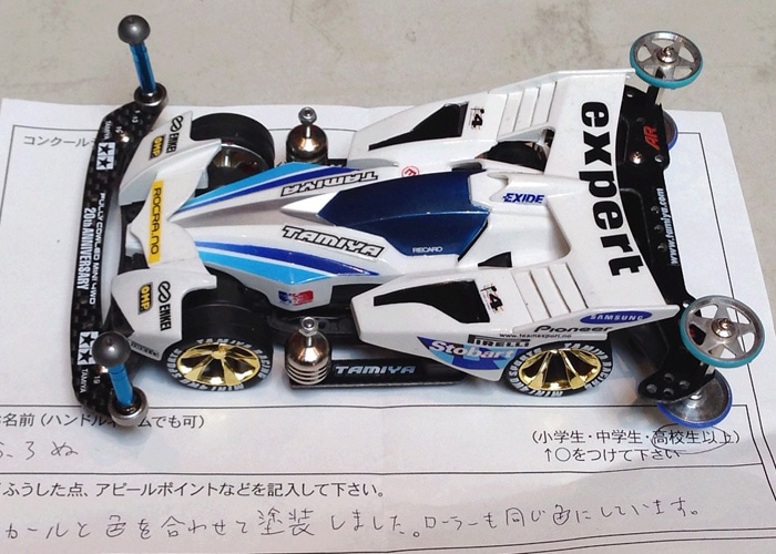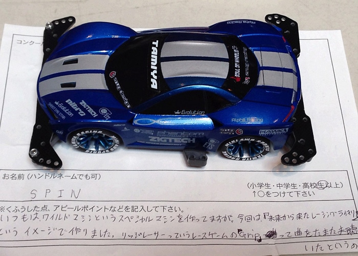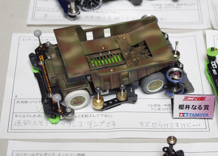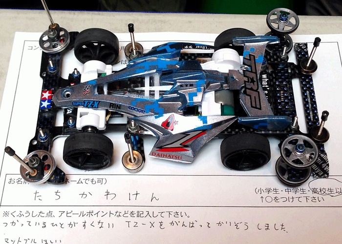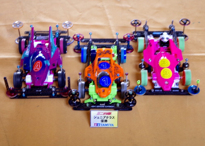 ・優勝車スペック ボディ:サンダーショットJr. クリヤーボディ シャーシ:VS モーター:ハイパーダッシュ2 ギヤ比:3.5:1 タイヤ:大径カスタム |