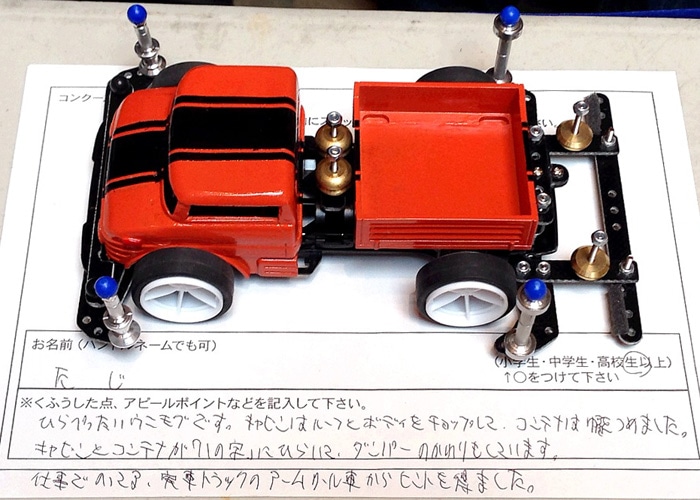 ・優勝車スペック ボディ:マンモスダンプ シャーシ:VS モーター:ハイパーダッシュ3 ギヤ比:3.5:1 タイヤ:ローハイトカスタム |