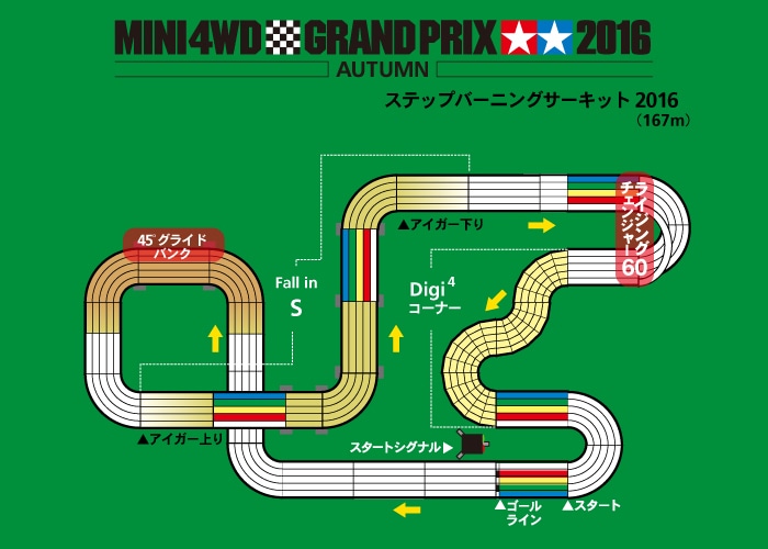 戦いの舞台となる公式サーキットは『ステップバーニングサーキット 2016』。初登場となる左回りの『グライドバンク45°』を下ると『Fall in S』。その後レーンチェンジでは『ライジングチェンジャー60』が登場。最終セクションは『Digi4 コーナー』、4連続デジタルではマシンスピードに影響も?