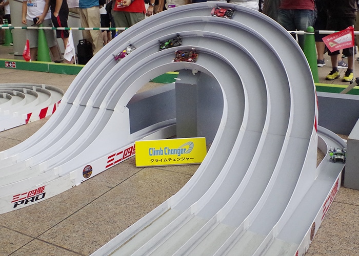 スタートしてすぐ現れるスロープセクションj『富士通ポップ』。スピードに乗ったマシンがそのまま弾んでコースアウトする危険性があります。 レーンチェンジも新セクションとして『クライムチェンジャー』を配置。通常とは逆、4台がバンク走行、1台がフラット走行となります。
