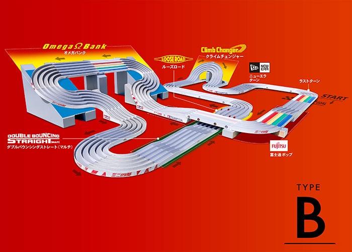 「クロスシステム」を取り入れ、走行特性が全く異なる4パターンのレイアウトが可能なサーキットです。福井大会は「タイプB」が登場!