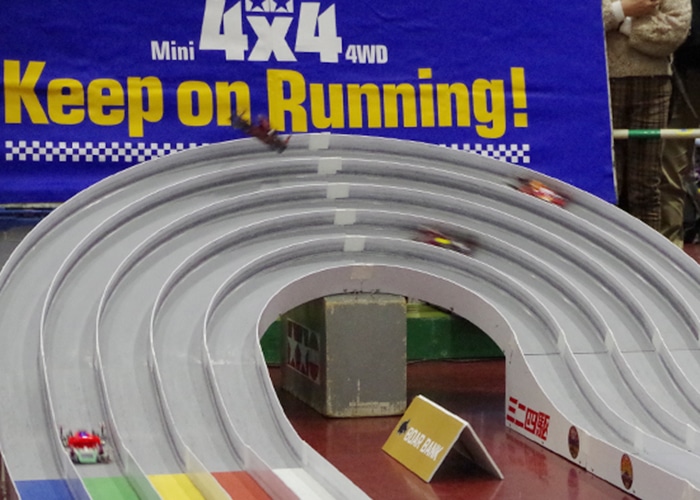 ●ミニ四駆グランプリ2019NEW YEAR 公式コース『2019 HEISEI FOREVER サーキット』(約183m)。まずは干支のイノシシにちなんで、『猪突猛進ストレート」。豪快に1年のスタートを切りたいところですが、途中ドラゴンバックによってその運命が左右されてしまうのか…。 続いて30度の『BOAR BANK』。イノシシが飛び出すか、イノシシに飛び掛かるか、いずれにしても体勢良くクリアして次のセクションにつなげたいところ。 コース中盤、『バウンシングホップ2019』ではスロープを上がった先にバウンシングストレート(A/B)を設置、スロープを下って180度ターン後にも同じくバウンシングストレート(A/B)と なっており、ハイスピードで一気に通過。 その後は『35度セレブレイトチェンジャー』、最終セクションはまたも干支ネーミングの『ウリボウターン』。 チェンジャーは35度、そしてグライドバンクは20度と角度が異なるバンクセクションにS字コーナーのコンビネーションをウリボウが跳ねるようリズミカルに通り抜ける、約183mのコースです。