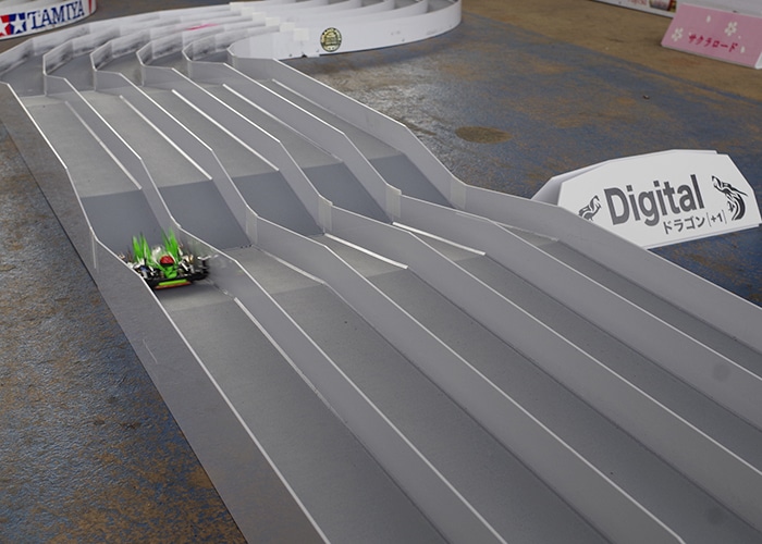 ●ミニ四駆グランプリ2019SPRING公式コース『ステップサーキット 2019』(約213m)。スタートしてまず待ち構えるのは、ピンクの路面が存分に春を感じさせる『サクラロード』。 これまでにないテクスチャー感をもつ路面に対してタイヤのグリップがどうなるか?マシンの挙動も合わせて気になるところです。 続く『グライドバンク30』をクリアしてS字カーブを通過した後には、子供の日をフィーチャー、鯉のぼりにちなんだ複合セクション『Carp Streamer』が登場。 滝に見立てた上りスロープからの180度ターンに続き、鯉が跳ねるがごとく『KOI JUMP』ことドラゴンバックとスロープの二段降下によってマシンのバランスが試されるゾーンです。 レーンチェンジ『ライシングチェンジャー60』を通り抜けると、そこは平成を終えてこれから迎える新たな時代にふさわしい最後の難関『デジタルゾーン』が待ち受けます。 前後ローラーが激しく揺さぶられるデジタルカーブに加え、新セクション『デジタルドラゴンバック』が出迎え、その挙動は誰にも予想できないイレギュラーなものとなるのか?期待と不安が入り混じる新セクションです。 これらを通過できたマシンが、見事新時代を迎えて完走となる、約213mのコースです。
