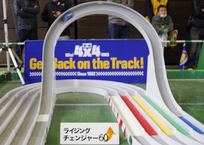 ●ミニ四駆グランプリ2019SPRING公式コース『ステップサーキット 2019』(約213m)。スタートしてまず待ち構えるのは、ピンクの路面が存分に春を感じさせる『サクラロード』。 これまでにないテクスチャー感をもつ路面に対してタイヤのグリップがどうなるか?マシンの挙動も合わせて気になるところです。 続く『グライドバンク30』をクリアしてS字カーブを通過した後には、子供の日をフィーチャー、鯉のぼりにちなんだ複合セクション『Carp Streamer』が登場。 滝に見立てた上りスロープからの180度ターンに続き、鯉が跳ねるがごとく『KOI JUMP』ことドラゴンバックとスロープの二段降下によってマシンのバランスが試されるゾーンです。 レーンチェンジ『ライシングチェンジャー60』を通り抜けると、そこは平成を終えてこれから迎える新たな時代にふさわしい最後の難関『デジタルゾーン』が待ち受けます。 前後ローラーが激しく揺さぶられるデジタルカーブに加え、新セクション『デジタルドラゴンバック』が出迎え、その挙動は誰にも予想できないイレギュラーなものとなるのか?期待と不安が入り混じる新セクションです。 これらを通過できたマシンが、見事新時代を迎えて完走となる、約213mのコースです。
