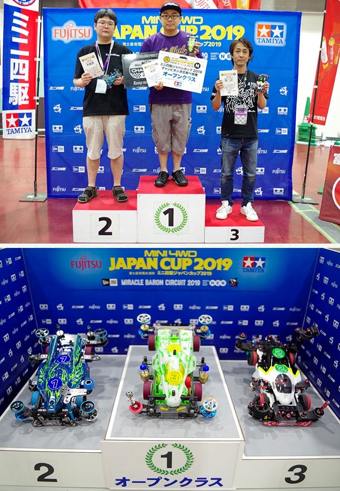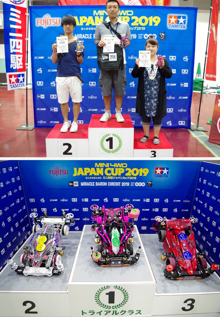 ●ミニ四駆ジャパンカップ2019公式コース『ミラクルバロンサーキット 2019 』(約225m)。大会地域ごと4パターンに変化するレイアウト、今回は『NORTH』が戦いの舞台!スタートしてまず最初の難関セクション『デジタルゾーン2』。SPRINGで活躍した『デジタルゾーン』をバージョンアップさせた、コースアウト率No.1の最重要ポイントだ!続く180°カーブ『ニューエラターン』からの、重量次第で角度が変わる『キッカーフラップ』をどう攻略するのか!?その後、ストレートとカーブを挟み速度が乗った状態で突入する『富士通ポップ』は、立体セクションでバランスを崩しやすいため、その先に待ち受けるレーンチェンジ『ライジングファントムチェンジャー』の難易度を上げる要素になっている。これらを通過した先は、ロングストレートとなっており一気にスピードを上げたいところだが、3コースに設置された『バランシングストレート』で失速させないために、マシンの均衡を保つセッティングは欠かせない!そして最後の『ラストターン』を抜けたマシンが一周完走となる、全長約225mのコースです。 さらにミニ四駆ビギナーのための『トライアルクラス』が新登場。こちらは初めて大会に参加される、また競技志向ではない方向けに設立されたクラスで、あなたの「ミニ四駆やってみた」を応援します!『トライアルクラス』が新たに加わり、5種類のクラスに増えたジャパンカップ2019は、幅広くレーサーに楽しんでいただける夏の祭典を目指します!